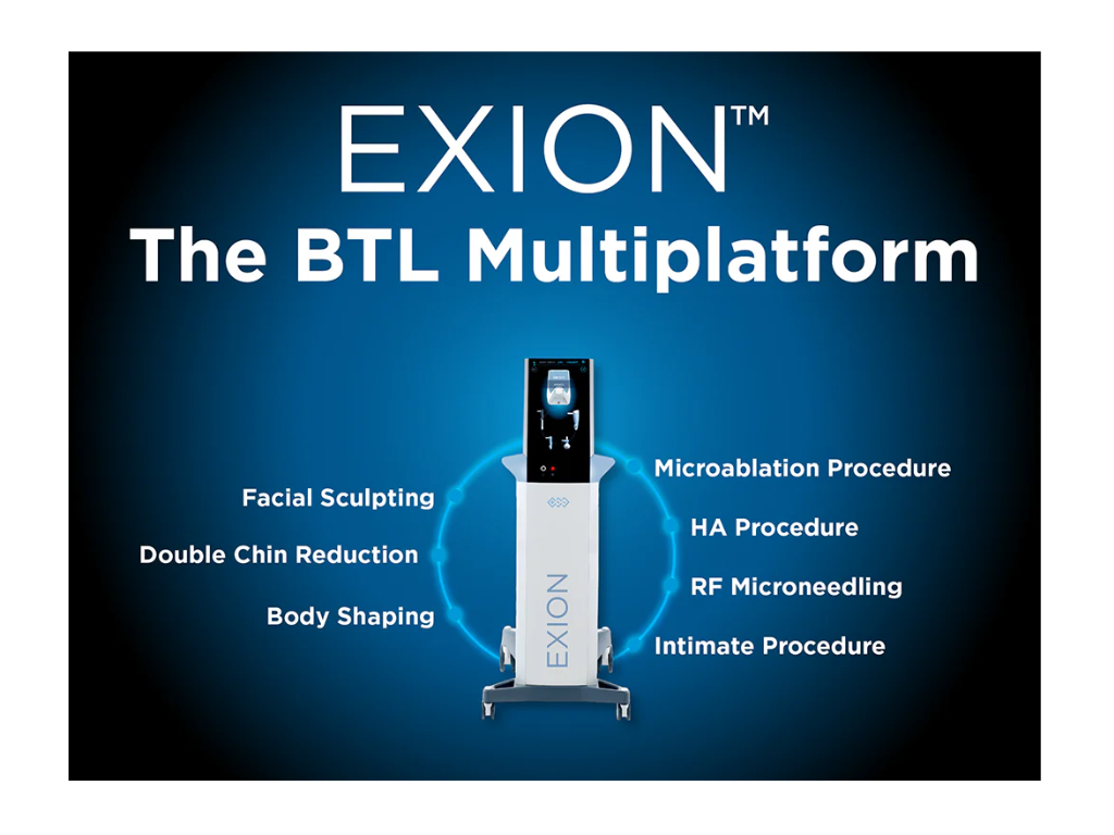 The Exion multiplatform uses various specialized medical handpieces/devices that work with various medical technologies such as advanced radiofrequency, microneedling, ultrasound, or high-intensity facial electrical stimulation (HIFES) energy. Controlled RF energy deep into the skin layers, heats the tissue to stimulate collagen and elastin production. As collagen is produced, the skin becomes firmer, smoother, and more youthful over time. Microneedling may be used to deliver the RF energy into the skin. The RF energy may also be used with ultrasound technologies to stimulate the fibroblasts to produce more collagen, elastin, and hyaluronic acid. RF energy can also be used with targeted ultrasound to stimulate collagen, elastin, and hyaluronic acid production also. RF energy may also be used with high-intensity focused electromagnetic (HIFES) energies to tighten, tone, and lift the face and neck. With HIFES it contracts and works the facial or neck muscles. These various treatments are performed using specialized handpieces/devices that work with the Exion multiplatform to gently promote natural skin rejuvenation for a more youthful look. Exion is quick, with little to no discomfort, and does not require any recovery time. Most patients experience a noticeable improvement in skin laxity and texture after just one session.